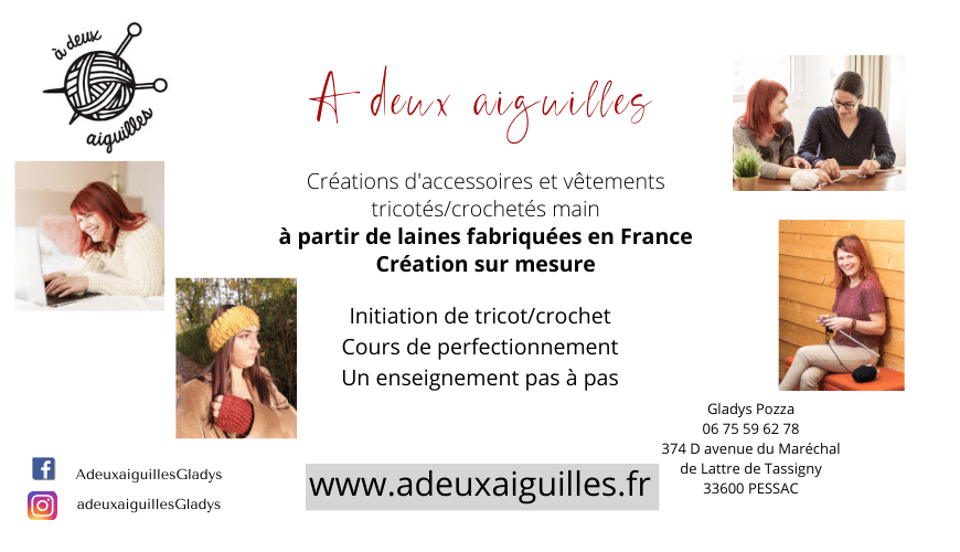 J’ai déposé la marque “à deux aiguilles”, une marque française de création de vêtements et d’accessoires tricotés et/ou crochetés à la main. J’utilise des laines fabriquées en France et de qualité supérieur.
